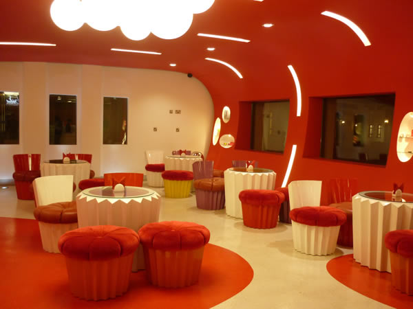 The interior of the Red Velvet Cupcakery is best described as a cross between Tim Burton’s, Charlie and the Chocolate factory and Stanley Kubrick’s, 2001 a space odyssey.